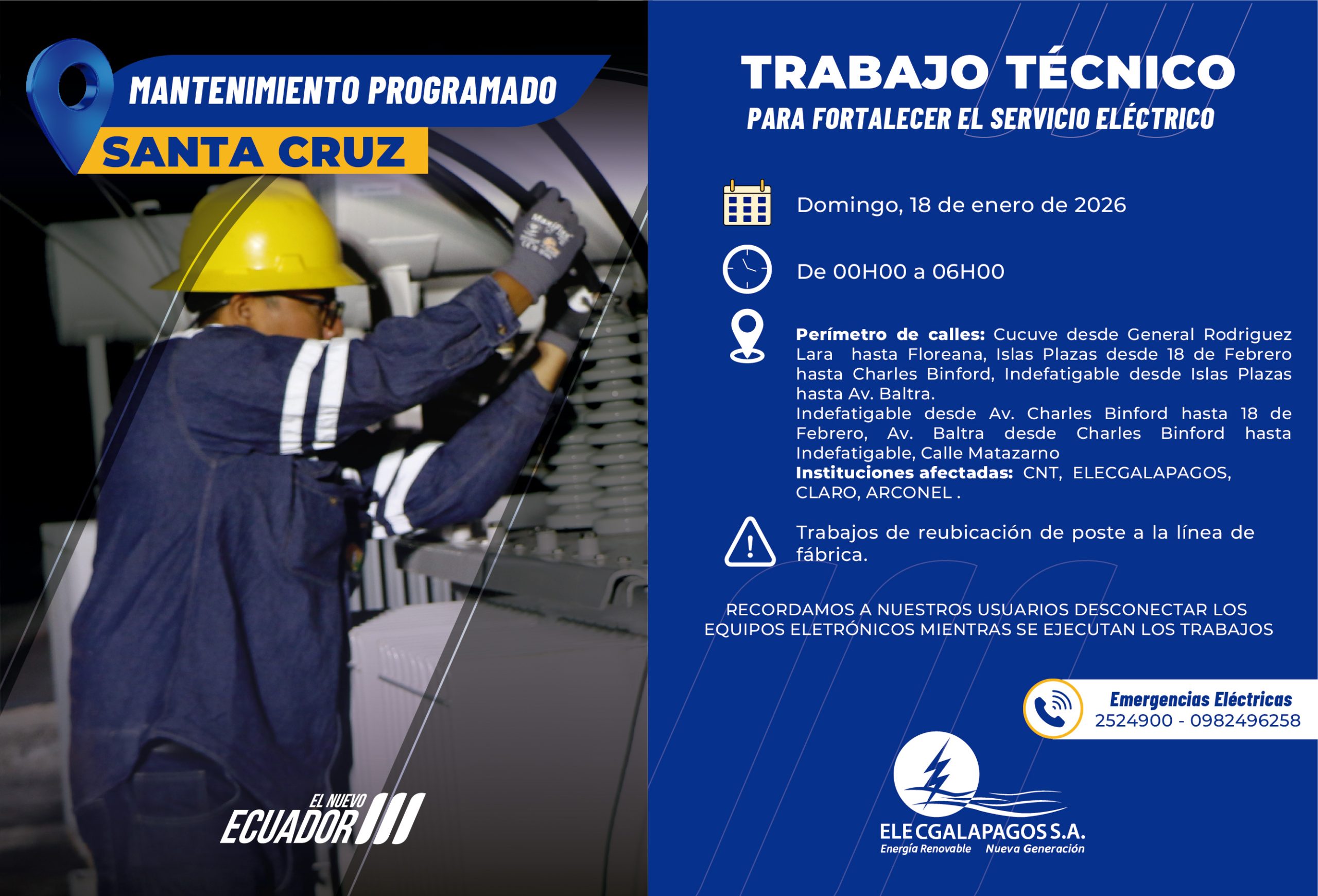 Domingo 18/01/2026 00H00-06H00 Trabajos de reubicación de poste a la línea de fábrica. Perímetro de calles: Cucuve desde General Rodríguez...