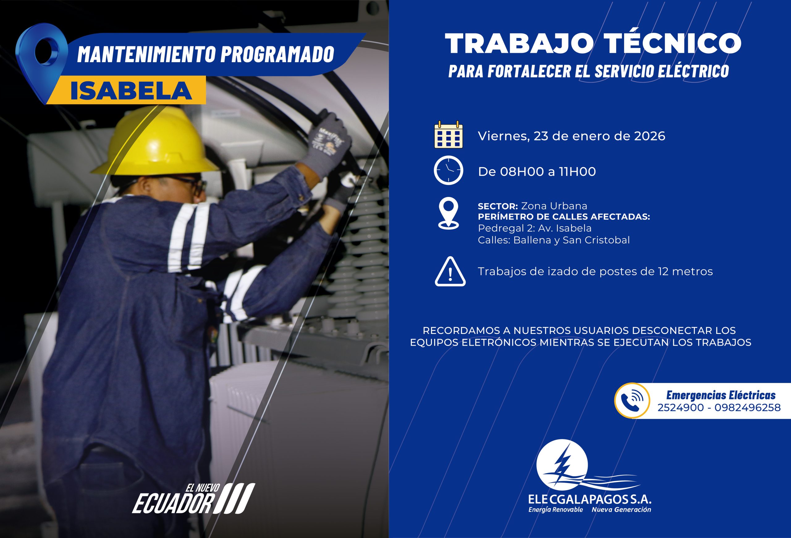 Vier 23/01/2026 08H00-11H00 Trabajos de izado de postes de 12 metros. SECTOR: Zona UrbanaPERÍMETRO DE CALLES AFECTADAS:Pedregal 2: Av. IsabelaCalles:...