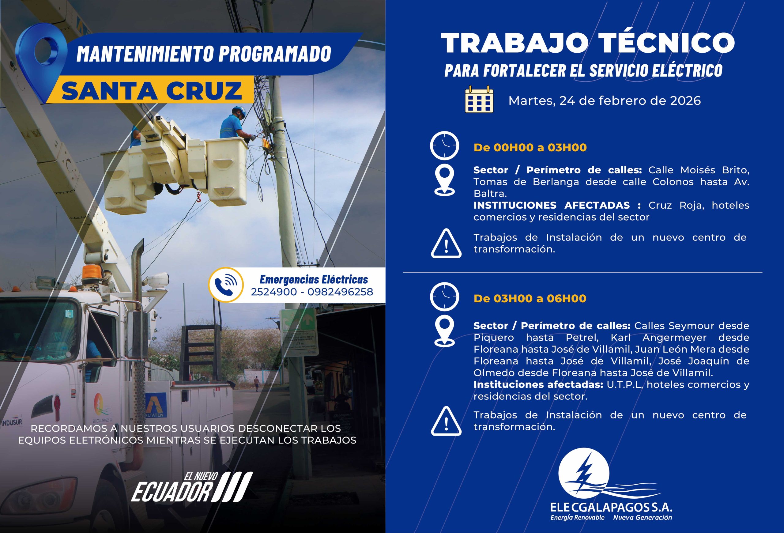 Martes 24/02/2026 00H00-03H00 Sector / Perímetro de calles: Calle Moisés Brito, Tomas de Berlanga desde calle Colonos hasta Av. Baltra.Instituciones...