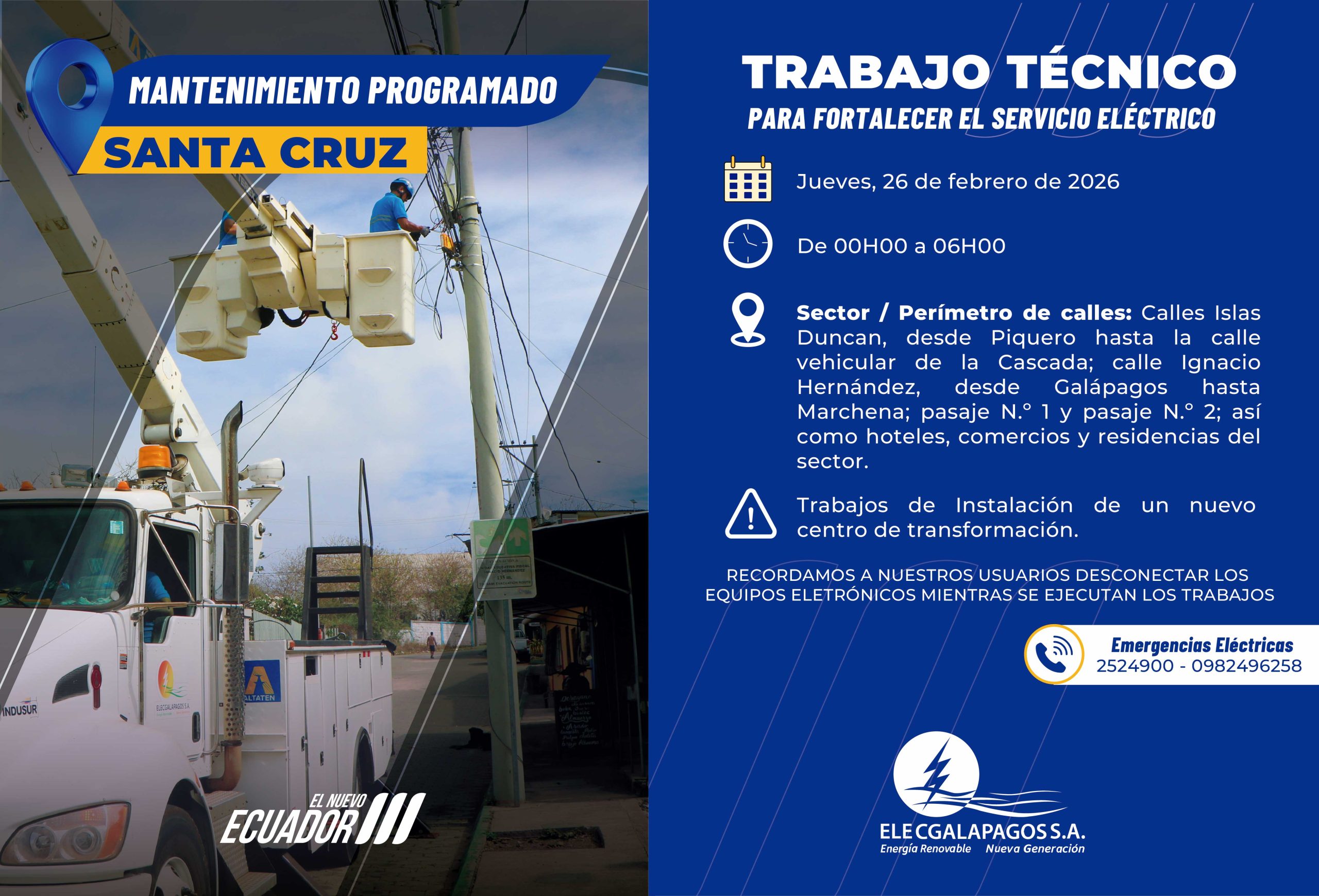 Fecha: Jueves 26/02/2026 Hora: 03H00-06H00 Actividades: Trabajos de repotenciación del centro de transformación, aumentando su capacidad de 150 kVA a...