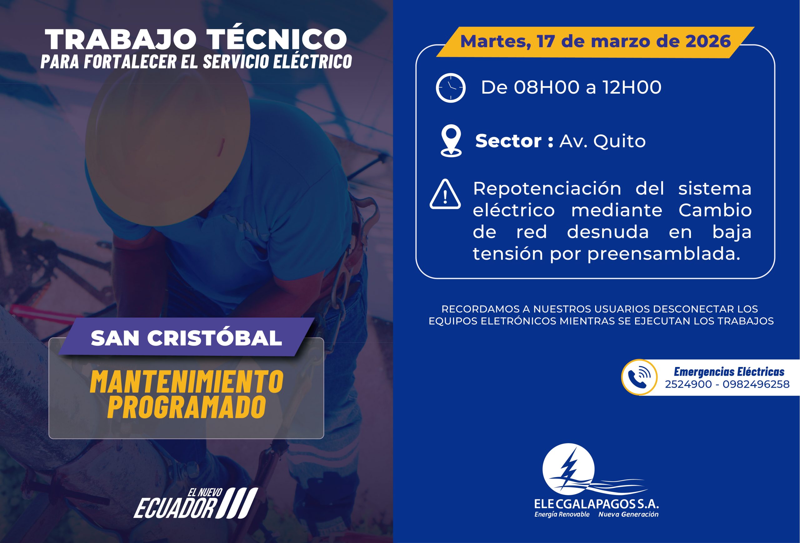 Fecha: Martes, 17/03/2026 Hora: 08H00-12H00 Actividades: Repotenciación del sistema eléctrico mediante cambio de red desnuda en baja tensión por preensamblada....