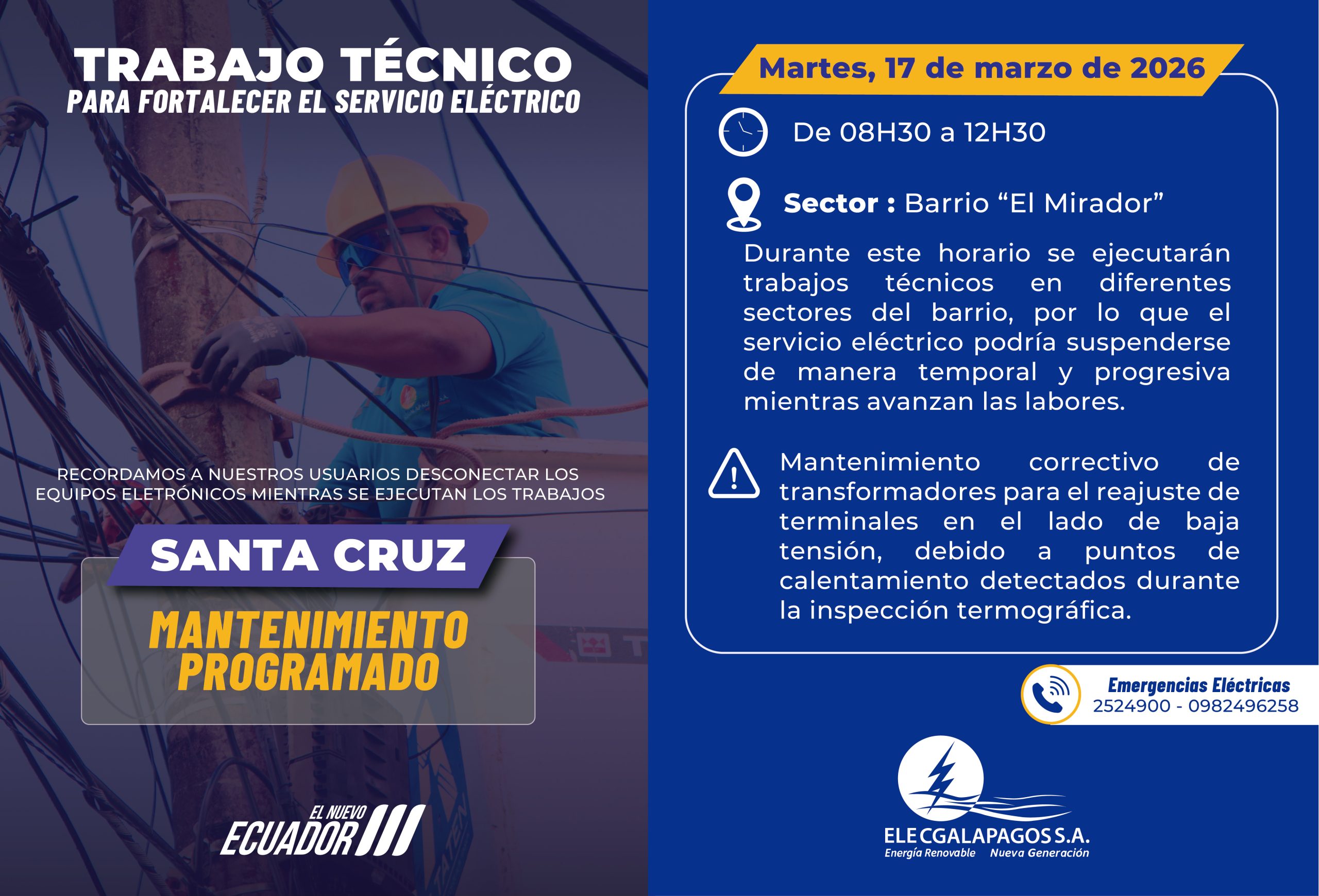 Fecha: Jueves 12/03/2026 Hora: 08H00-10H00 Actividades: Trabajos de cambio de transformador. Sector : Cerro Verde, Las Goteras, Cerro Gato y...