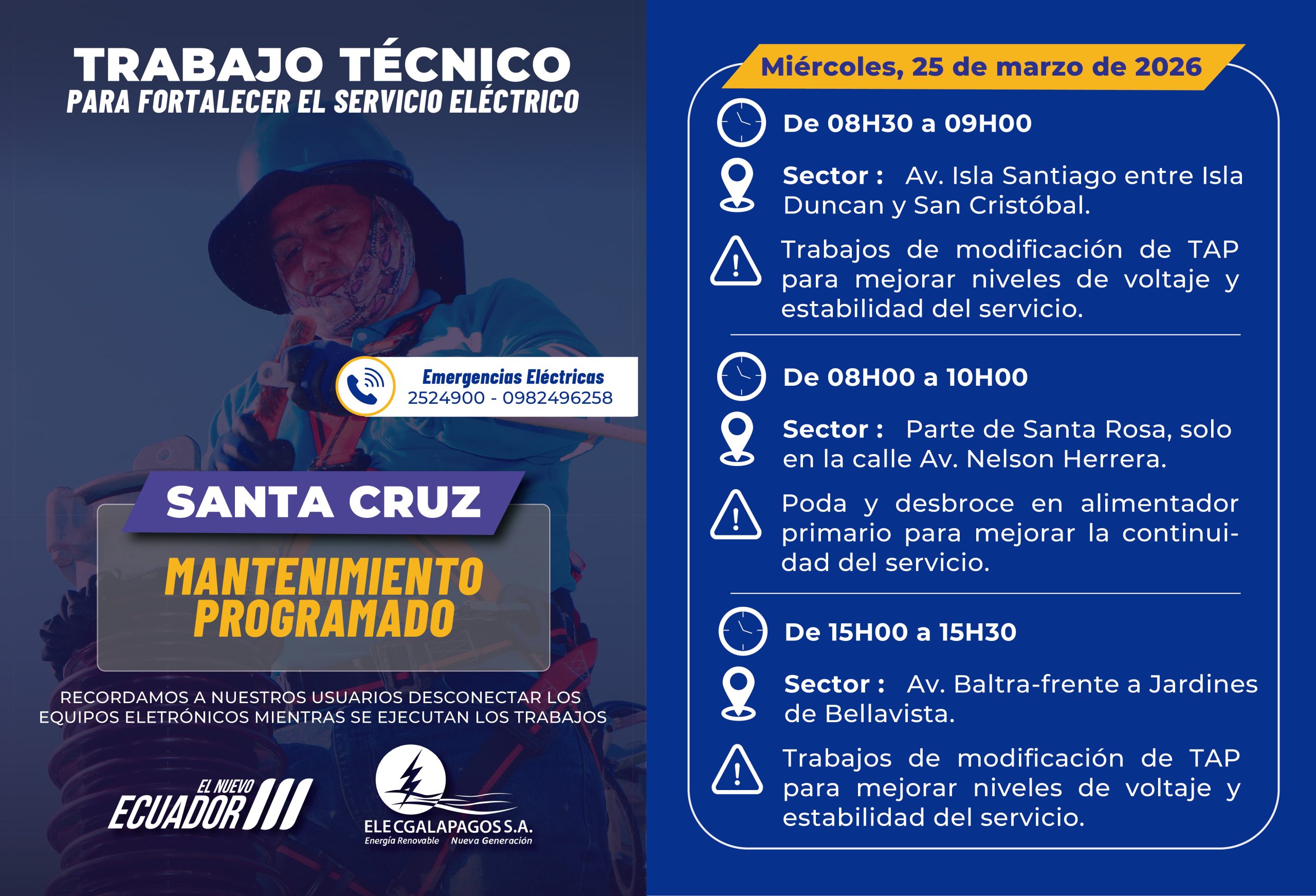 Miércoles 25/03/2026 08H30-09H30 Sector : Av. Isla Santiago entre Isla Duncan y San Cristóbal.Trabajos de modificación de TAP para mejorar...