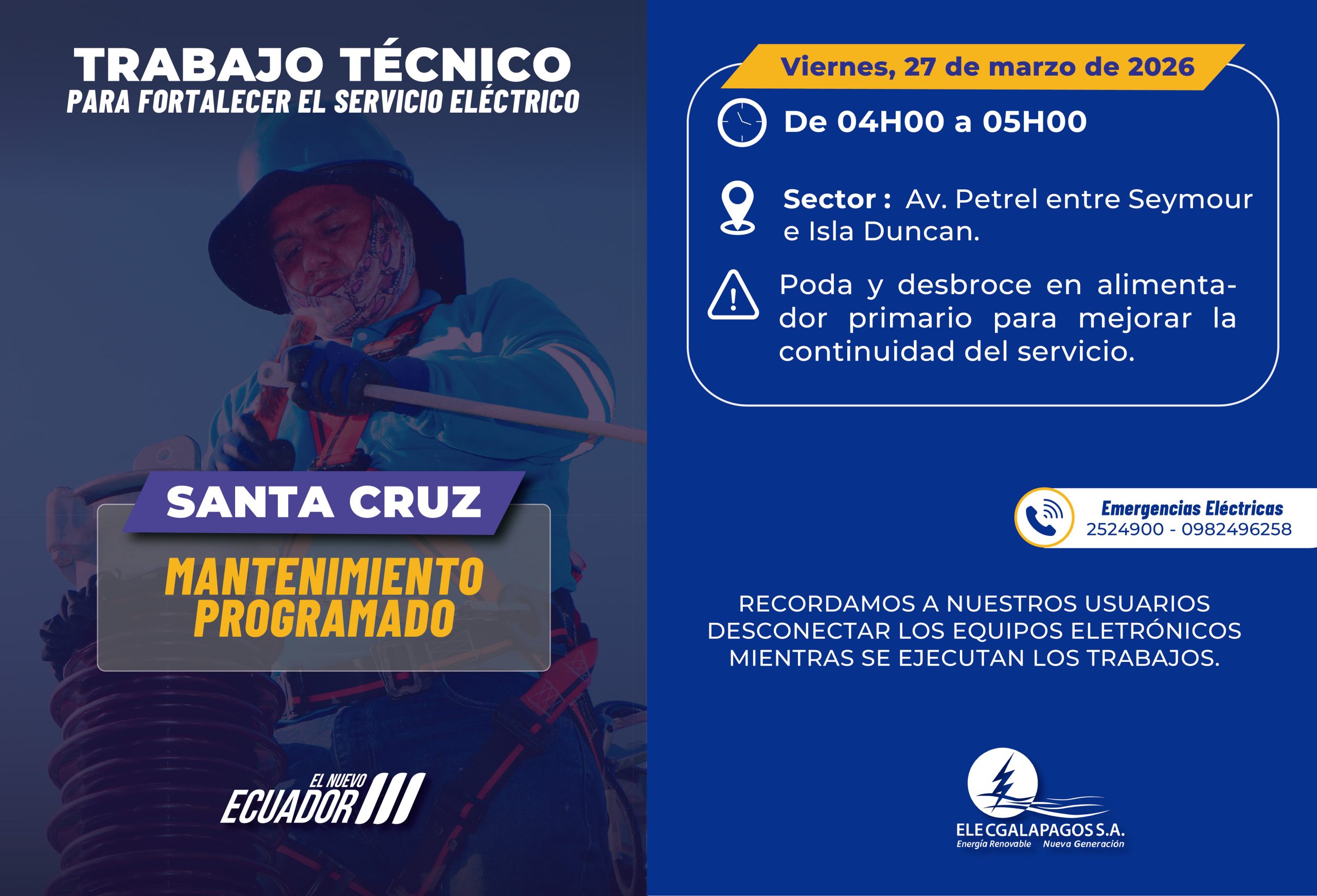 Viernes 27/03/2026 04H00-05H00 Sector : Av. Petrel entre Seymour e Isla Duncan Poda y desbroce en alimentador primario para mejorar...
