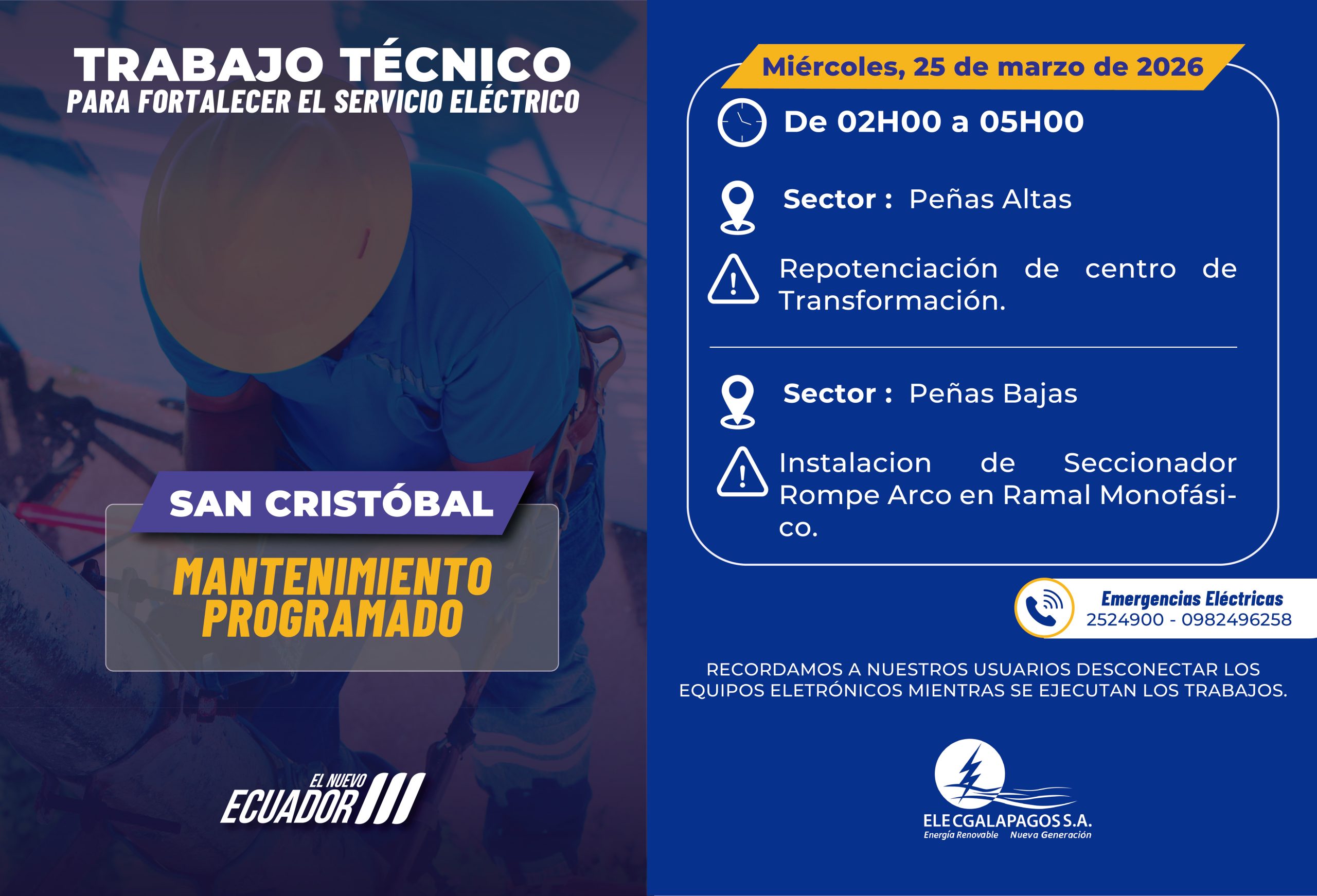 Fecha: Miercoles, 25/03/2026 Hora: 02H00-05H00 Sector : Peñas Altas Actividades: Repotenciación de centro de Transformación. Sector : Peñas Bajas Actividades:...