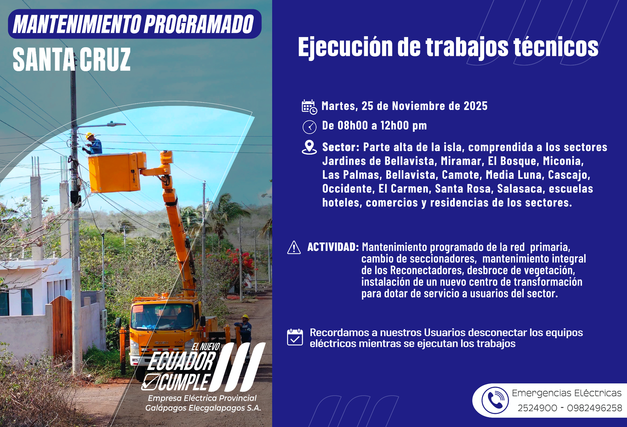 Mantenimientos Programados Santa Cruz -Martes 25 de noviembre 2025: De 08h00 a 12h00 pm Ejecución de Trabajos Técnicos Recordamos a...