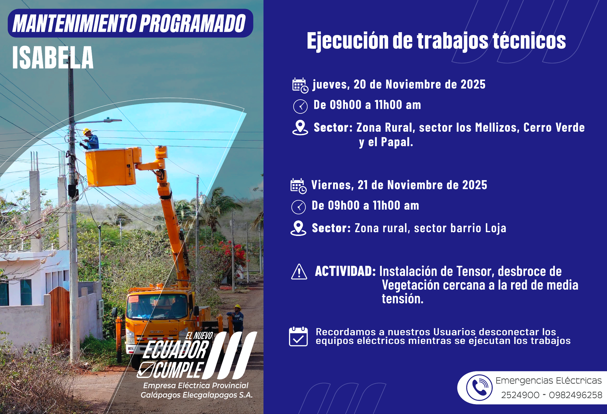 Mantenimiento ProgramadoTrabajo Técnico para Fortalecer el Servicio EléctricoIsabelaJueves, 20 y Viernes, 21 de noviembre 2025