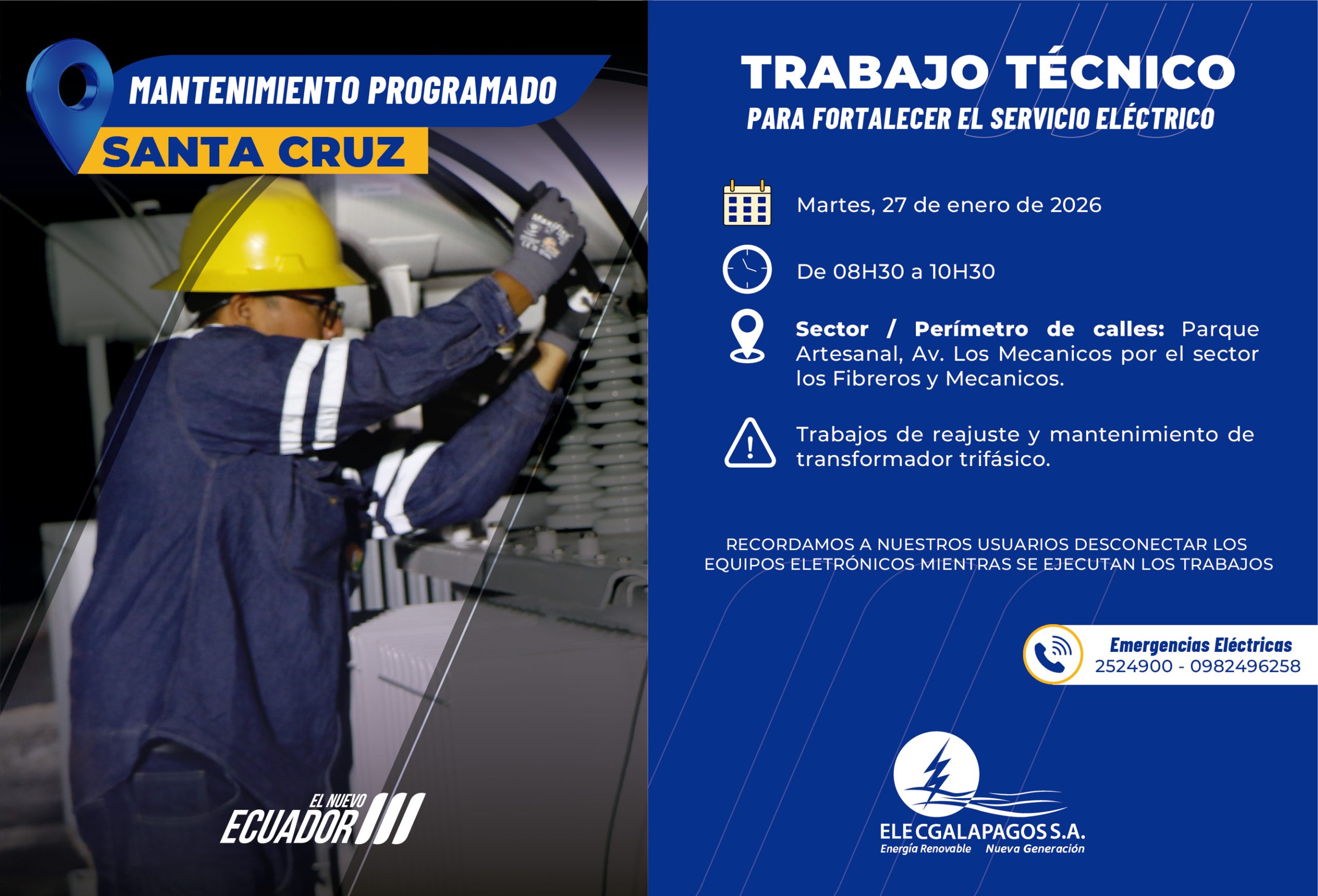 Martes 27/01/2026 08H30-10H30 Trabajos de reajuste y mantenimiento de transformador trifásico. Sector / Perímetro de calles: Parque Artesanal, Av. Los...