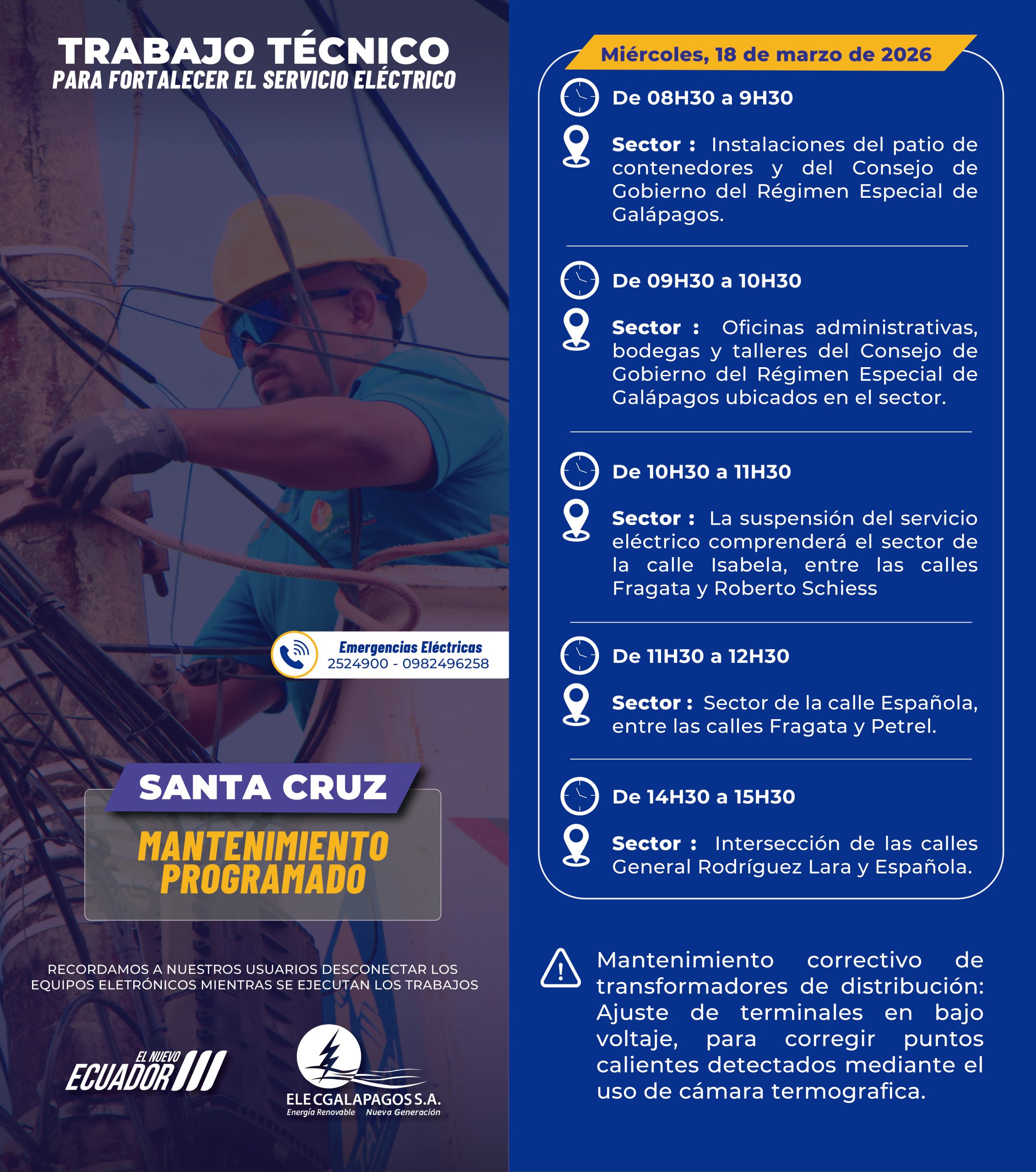 Horario: 11H00 - 14H00 Sectores Afectados: Barrio Loja Instalación de un transformador de distribución para optimizar y redistribuir la carga...