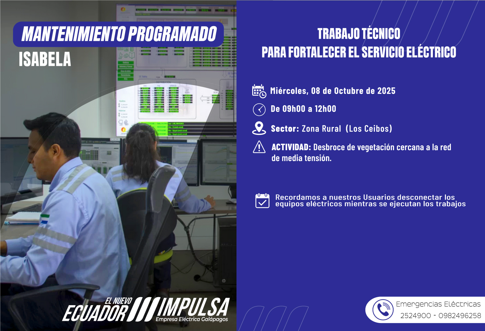 Mantenimiento Programado Trabajo Técnico para Fortalecer el Servicio Eléctrico Isabela Miércoles, 08 de octubre 2025